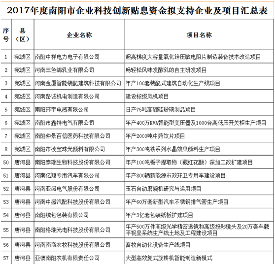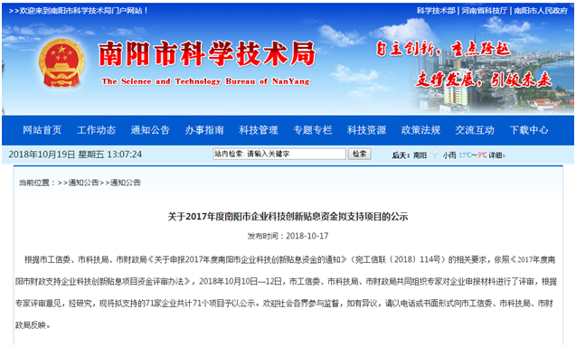 根據(jù)市工信委、市科技局、市財(cái)政局《關(guān)于申報(bào)2017年度南陽市企業(yè)科技創(chuàng)新貼息資金的通知》(宛工信聯(lián)〔2018〕114號(hào))的相關(guān)要求,依照《2017年度南陽市財(cái)政支持企業(yè)科技創(chuàng)新貼息項(xiàng)目資金評(píng)審辦法》,2018年10月10日—12日,市工信委、市科技局、市財(cái)政局共同組織專家對(duì)企業(yè)申報(bào)材料進(jìn)行了評(píng)審,根據(jù)專家評(píng)審意見,經(jīng)研究,現(xiàn)將擬支持的71家企業(yè)共計(jì)71個(gè)項(xiàng)目予以公示。歡迎社會(huì)各界參與監(jiān)督,如有異議,請(qǐng)以電話或書面形式向市工信委、市科技局、市財(cái)政局反映。