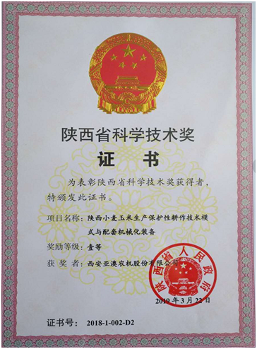 日前,全省科技創(chuàng)新大會(huì)暨科學(xué)技術(shù)獎(jiǎng)勵(lì)大會(huì)在西安隆重召開,省委書記胡和平出席會(huì)議并講話,省長劉國中主持會(huì)議,會(huì)議表彰了2018年度省科學(xué)技術(shù)獎(jiǎng)獲獎(jiǎng)項(xiàng)目,并向最高成就獎(jiǎng)及一等獎(jiǎng)獲獎(jiǎng)?wù)哳C發(fā)了獎(jiǎng)勵(lì)證書。亞澳農(nóng)機(jī)和西北農(nóng)林科技大學(xué)合作研發(fā)的“陜西小麥玉米生產(chǎn)保護(hù)性耕作技術(shù)模式與配套機(jī)械化裝備”項(xiàng)目成果榮獲省科技進(jìn)步一等獎(jiǎng)。