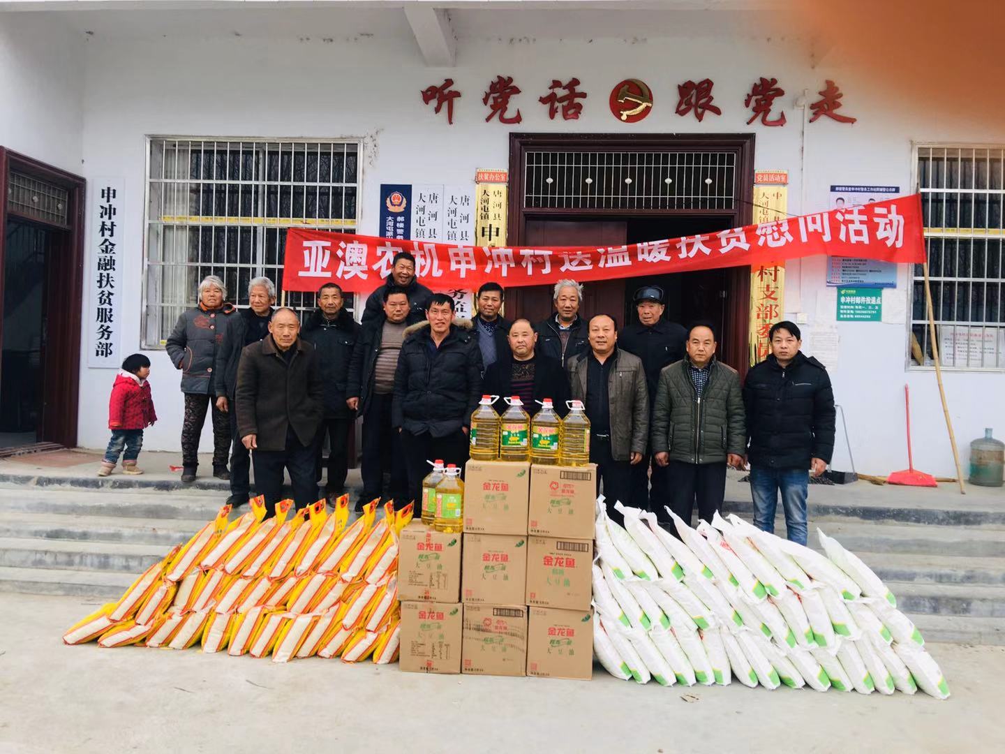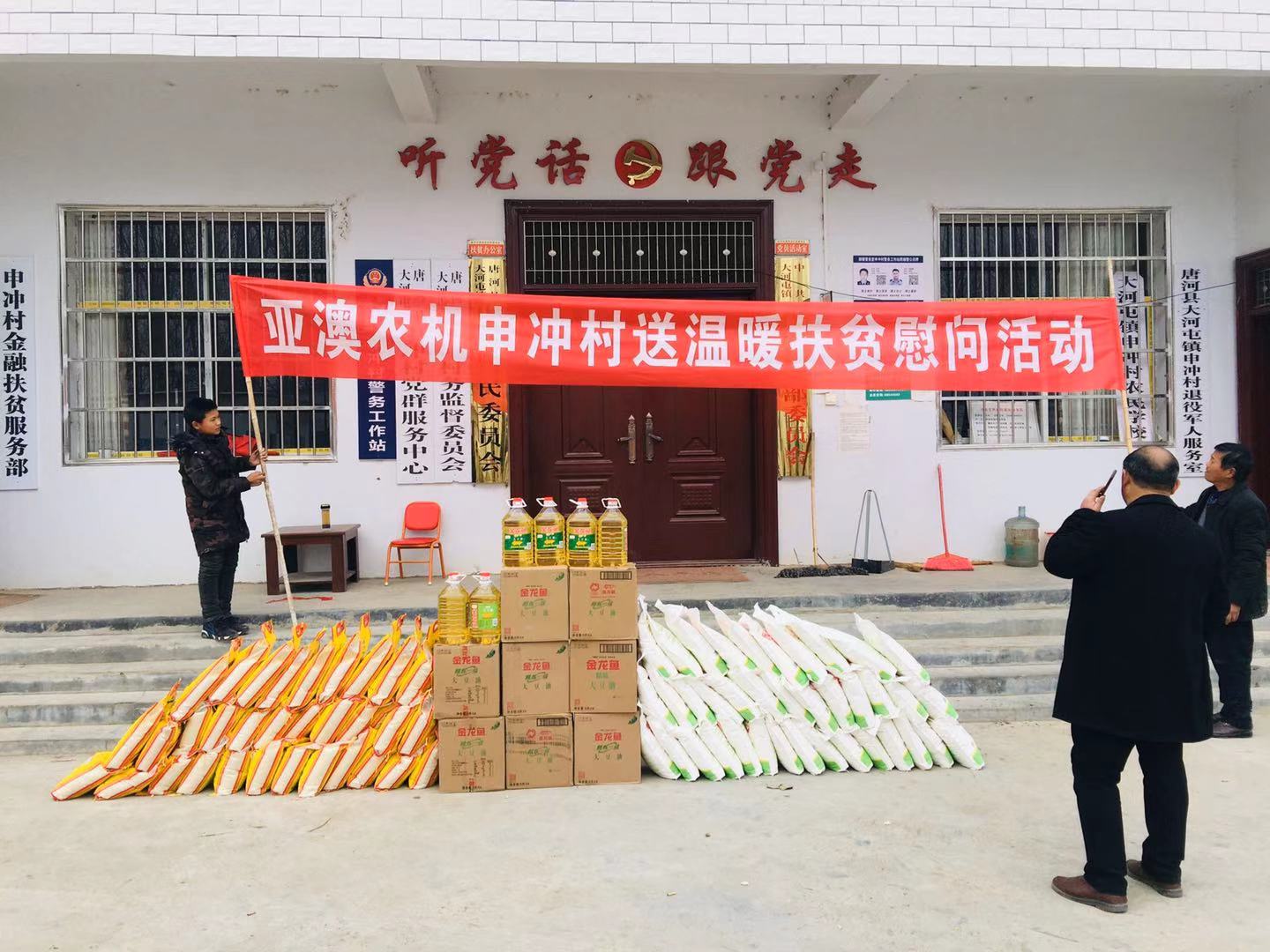 為積極貫徹落實(shí)唐河縣委縣政府”百企幫百村”的扶貧工作精神,履行企業(yè)社會責(zé)任,按照縣扶貧辦工作統(tǒng)一部署,亞澳農(nóng)機(jī)結(jié)合對口幫扶的申沖村實(shí)際情況,因地制宜,統(tǒng)籌規(guī)劃,務(wù)求實(shí)效,在2018-2019年開展了一系列的扶貧幫困工作。
