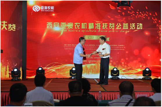 開機儀式上,中國農(nóng)機化協(xié)會還就“甘肅省蘭州市永登縣”精準扶貧工作給予亞澳高度的認可。永登縣團莊村屬干旱貧困山區(qū),全村現(xiàn)有7個村民小組,421戶、1696人。近年來,幫扶單位先后捐贈了30多臺(套)特色農(nóng)機具,但仍缺少大中型農(nóng)機具,農(nóng)機化服務能力不足,不能滿足農(nóng)業(yè)生產(chǎn)需求。此次中國農(nóng)業(yè)機械化協(xié)會聯(lián)合亞澳公司等有關(guān)單位向團莊村捐贈價值40多萬元農(nóng)業(yè)機械,必將對團莊和周邊鄉(xiāng)村農(nóng)業(yè)和農(nóng)村經(jīng)濟發(fā)展、全面建設(shè)小康社會起到很大地推進作用。